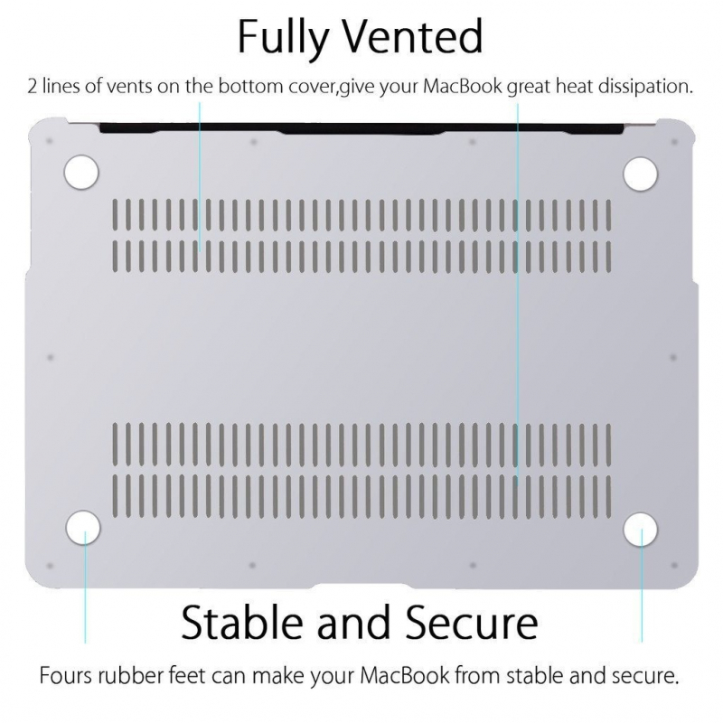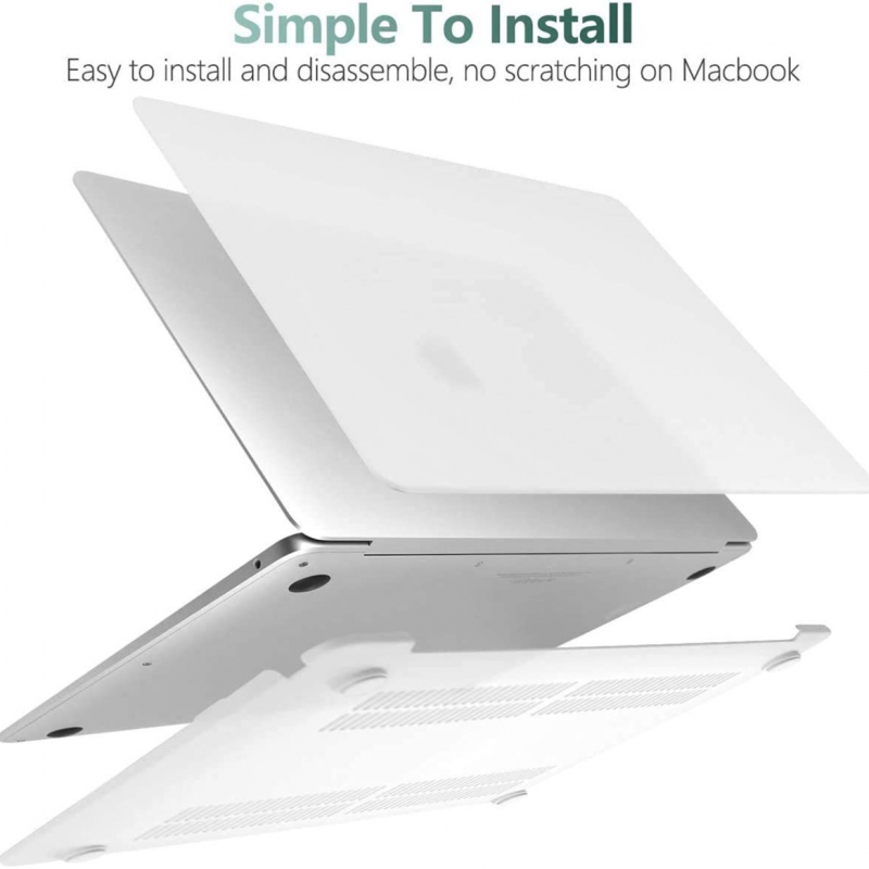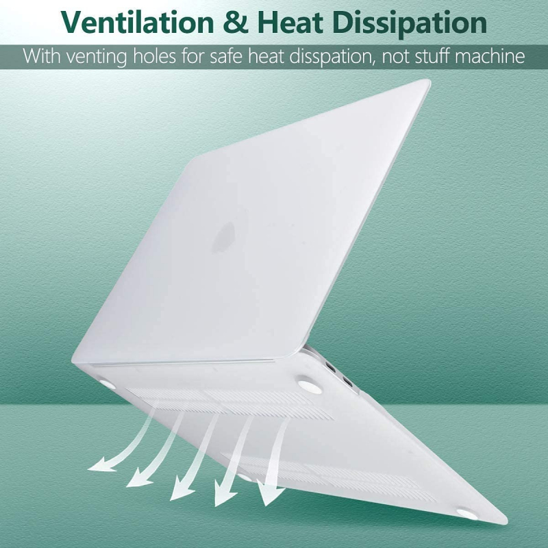 Design: Features a precise cut to fit the notebook, ensuring safe heat dissipation through ventilation holes. The design is transparent, allowing the original color of the MacBook to show through.