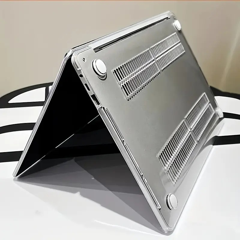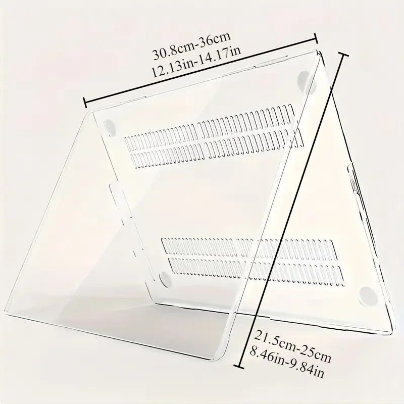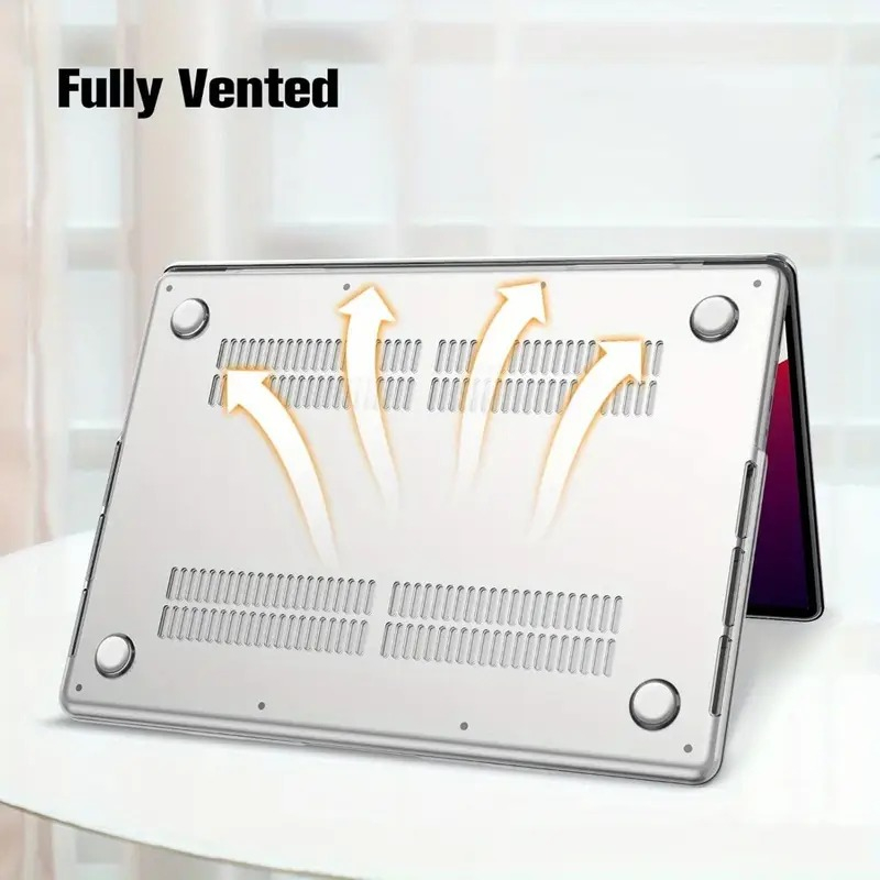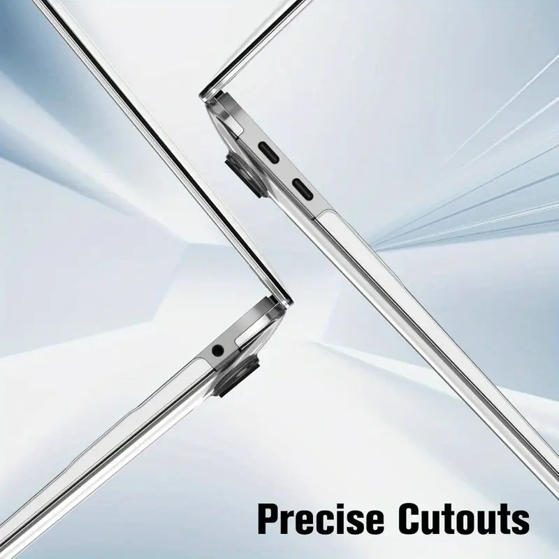 Design: Features a precise cut to fit the notebook, ensuring safe heat dissipation through ventilation holes. The design is transparent, allowing the original color of the MacBook to show through.