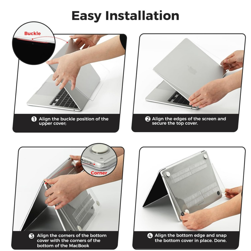 Design: It features a precise cut to fit the notebook, ensuring safe heat dissipation through ventilation holes. The design is transparent, allowing the original color of the MacBook to show through.