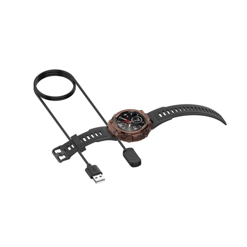 The product described is a replacement USB charging cradle specifically designed for Huami Amazfit GTS, GTR (42mm/47mm), and T-Rex smartwatches. Key features include: