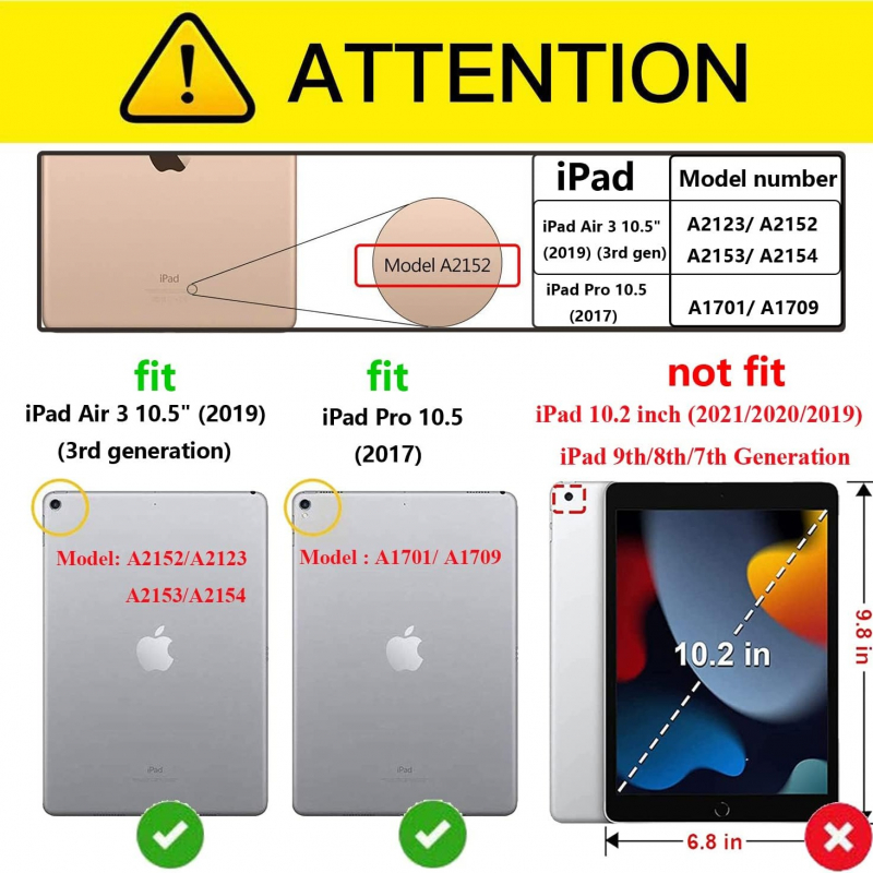 This case is compatible with the iPad Air 3rd Generation (10.5-inch, 2019 Release) with model numbers A2152, A2123, A2153, and A2154, as well as the iPad Pro 10.5-inch (2017 Release) with model numbers A1701 and A1709. Users are advised to carefully check their tablet's model number to ensure compatibility.