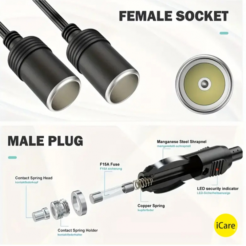 Safe & Secure Use – Firm male-to-female cigarette lighter connection prevents loose contact and ensures stable current flow.