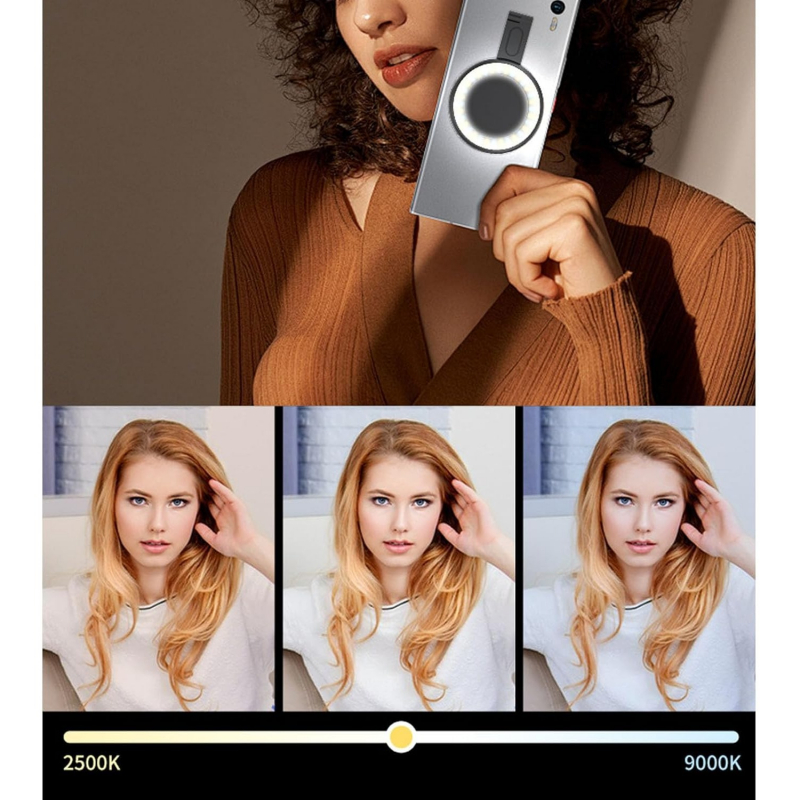The integrated soft light panel diffuses the LEDs, minimizing harsh shadows and producing a flattering effect on skin, ideal for selfies, portraits, and video calls.