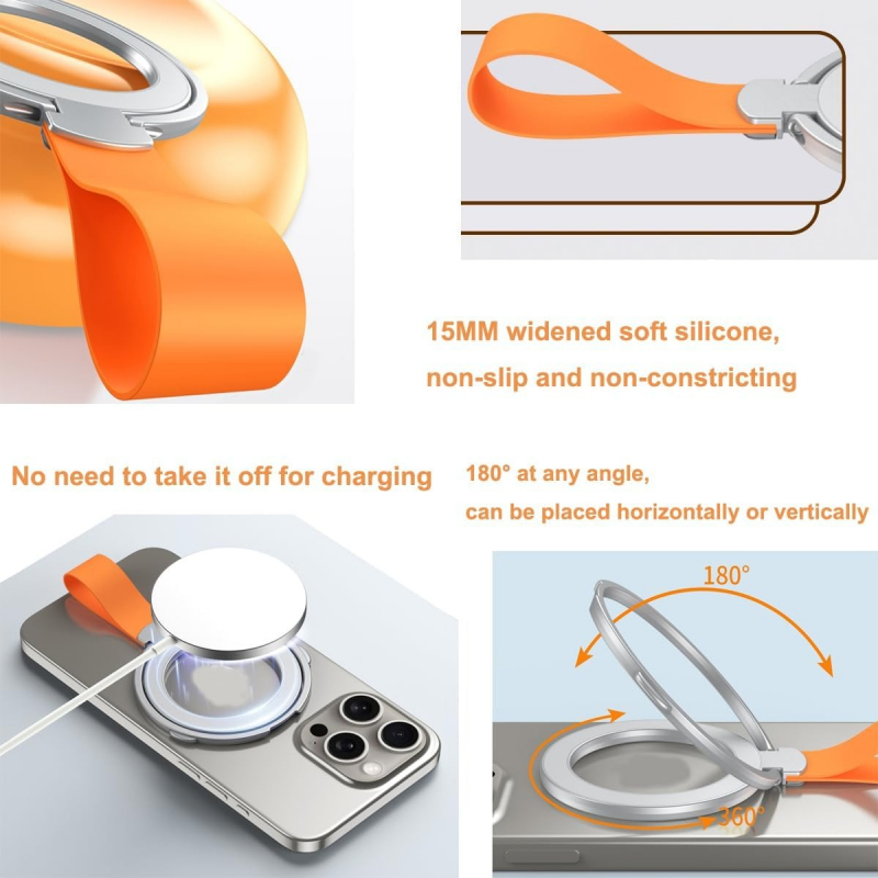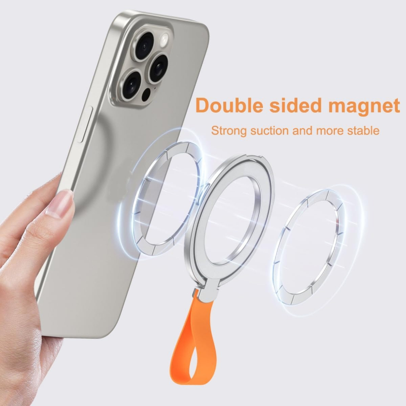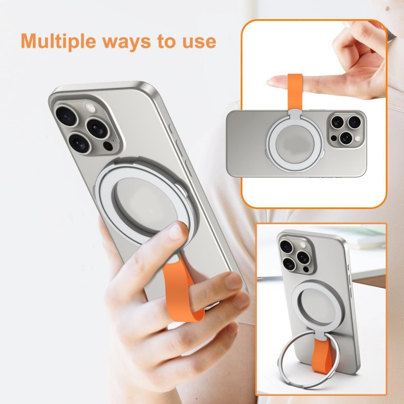 Strong magnetic attraction, a 360° rotating base, and a 180° folding ring provide flexibility for different viewing angles and grip positions.