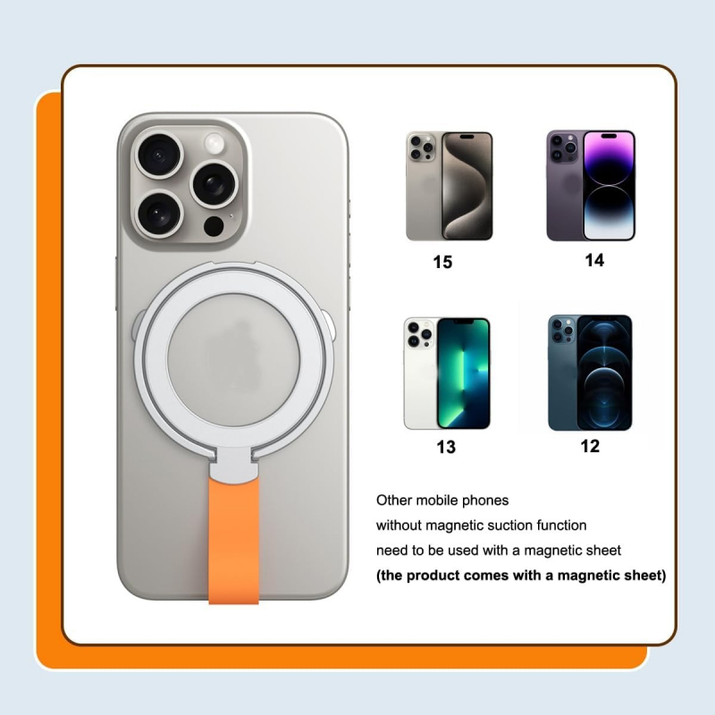 Compatible with phones featuring built-in magnetic suction (like iPhone 12, 13, 14, 15 series) and can be used with other smartphones by attaching included metal ring magnets.